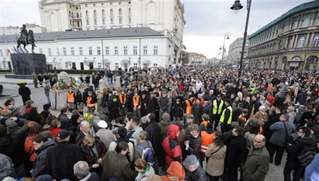 | Cientos de polacos se reunen frente al Palacio Presidencial, en Varsovia, para rendir homenaje al presidente Lech Kaczynski, quien murió en un accidente aéreo. Foto AP |